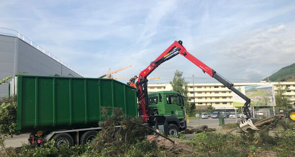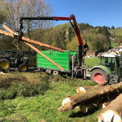 Bäume an der Strasse können wir mit dem Forwarder oder Kranwagen greifen.