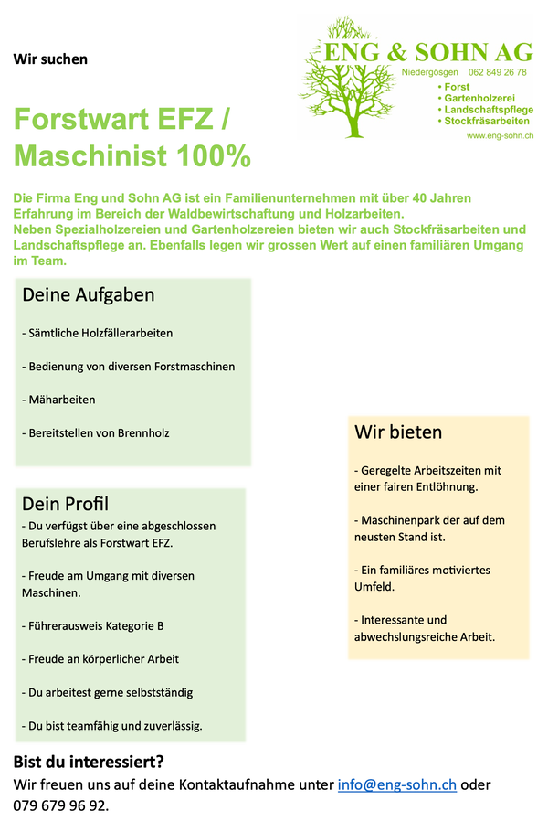 Aktuell suchen wir Forstwart EFZ/Maschinist 100%