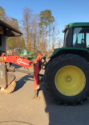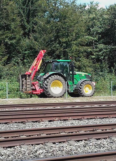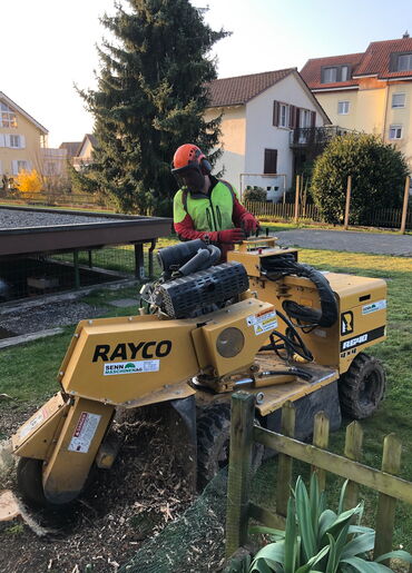 Die brachiale Fräse mit 90cm Scheibe macht vor keinem Stock halt. Angetrieben wird sie vom John Deere 6610.