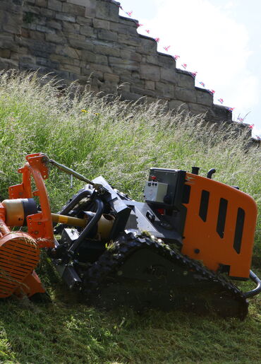 Der ferngesteuerte Raupenmulcher verfügt über einen kraftvollen 38 PS Dieselmotor. Die Maschine eignet sich für Arbeiten im steilen Gelände.